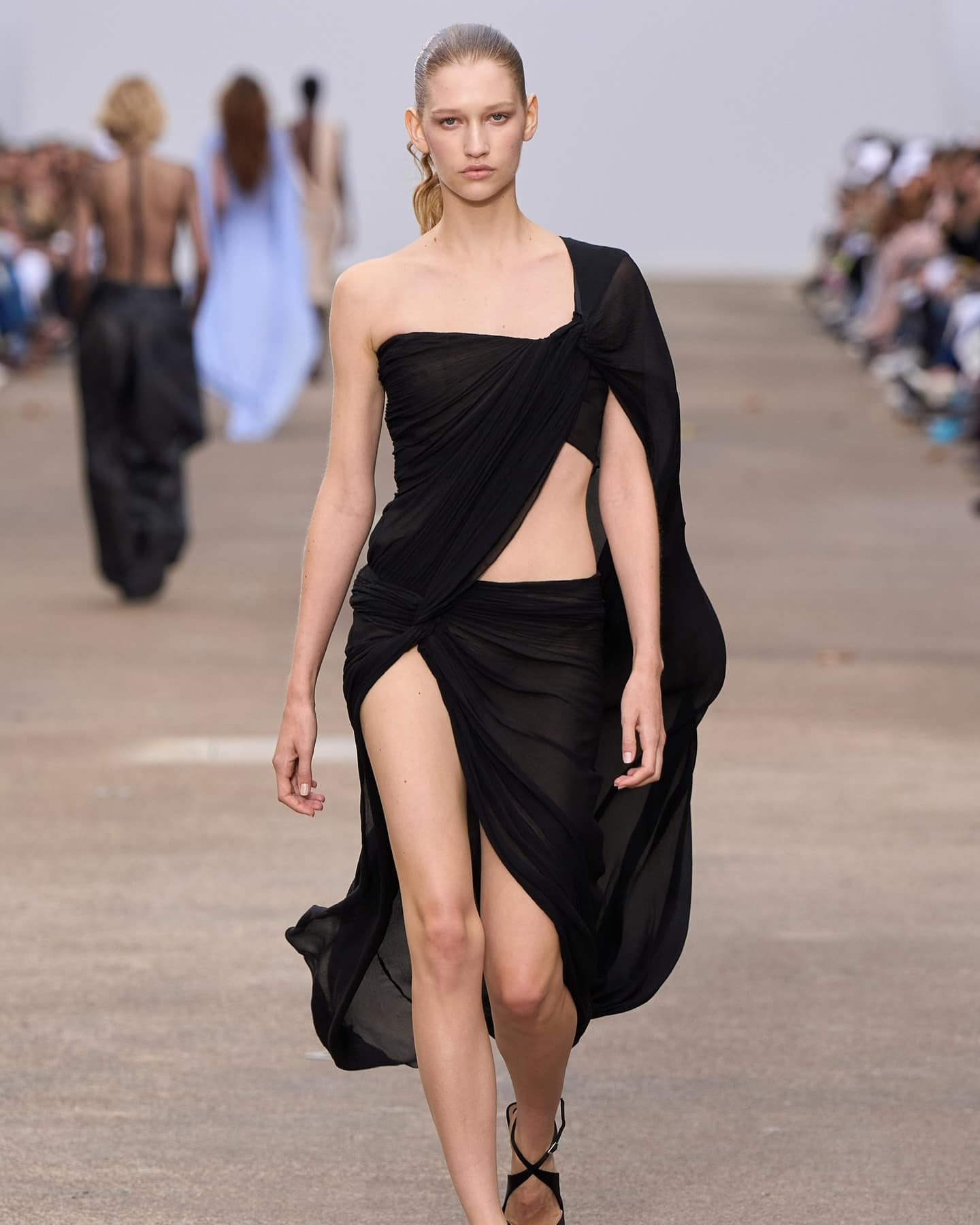Asimetrični izrezi koji pokrivaju samo jedno rame postali su osnovni element u kombinacijama za izlaske. U poslednjim kolekcijama viđeni su elegantni modeli haljina sa asimetričnim dekolteom, kao što su one iz kolekcije Coperni za jesen 2024.