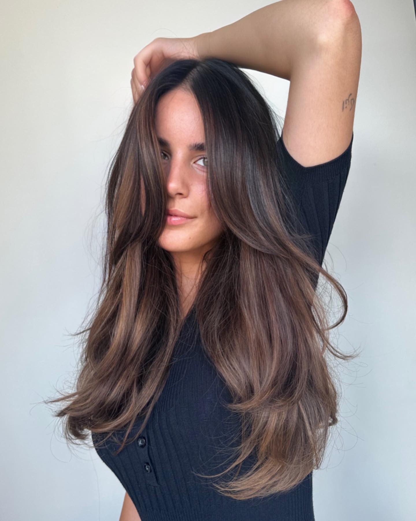 Za osveženje crne kose koristi se kombinacija tamnijih tonova – braon, crna i plavo-crna. Ova kombinacija stvara sofisticirani, višedimenzionalni efekat bez gubitka intenziteta prirodne boje.