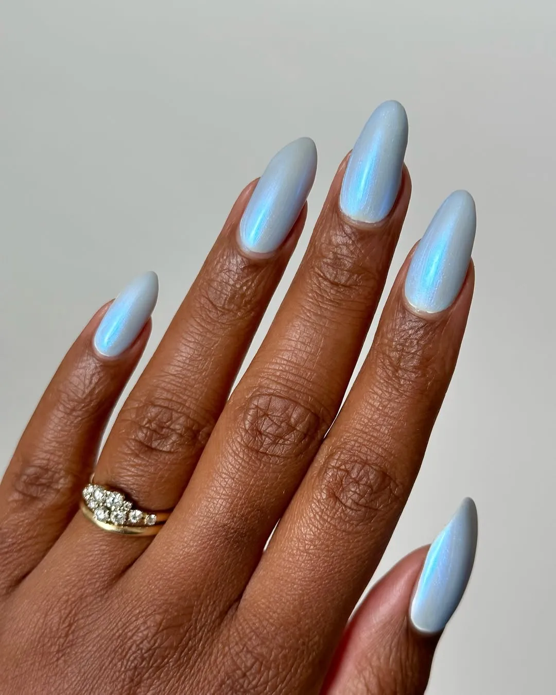 Prema tradiciji, mlada bi na svom venčanju trebalo da nosi nešto plavo, a nokti mogu biti savršen način da se ova simbolika uklopi u izgled. Svetloplave nijanse pružaju suptilan, ali efektan kontrast u odnosu na klasičnu belu haljinu. Blaga plava može izgledati nežno i bajkovito, dok varijante sa blagim metalik ili bisernim efektom donose dodatnu dozu sjaja.