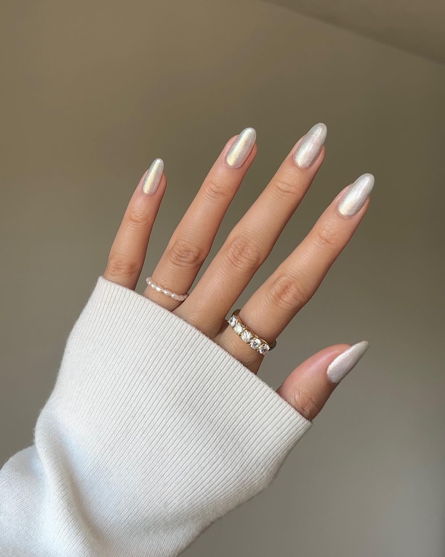 Ako se želi dodatna doza luksuza, hromirane i biserne završnice mogu podići svadbeni manikir na viši nivo. Takve teksture podsećaju na svetlucave materijale poput satena ili svile, koji su često korišćeni u izradi venčanica. Ovakav manikir može biti nosiv kao kompletan izgled ili samo kao akcenat, na primer kroz francuski manikir sa reflektujućim vrhovima.