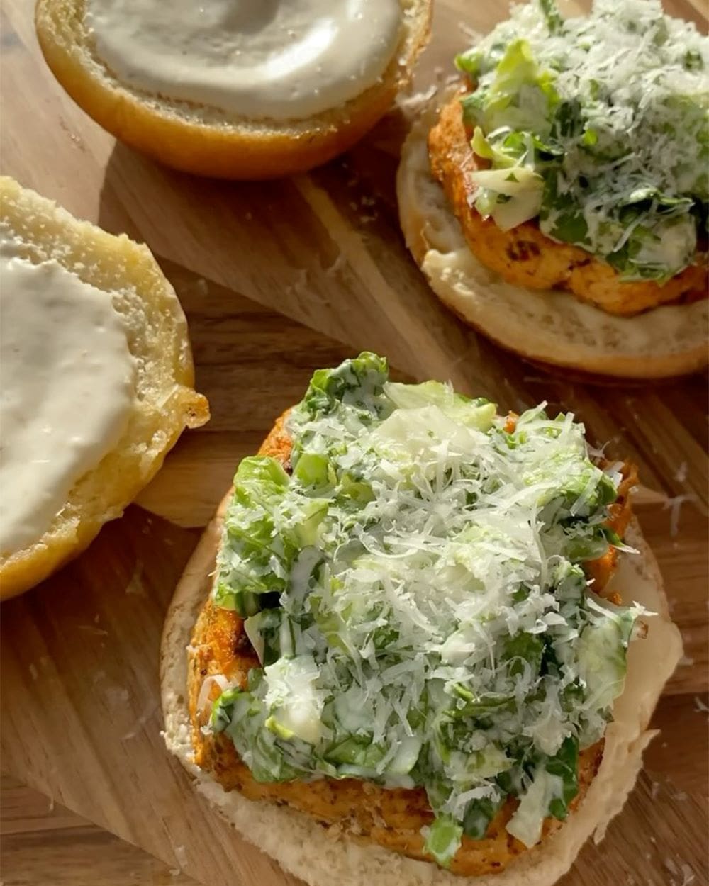 Sklopite sendviče: Namažite 1 kašiku Cezar dresinga na dno svake gornje polovinelepinje. Poređajte piletinu, Cezar salatu i 1 kašiku rendanog parmezana po sendviču. Dodajte gornje lepinje, lagano pritisnite i uživajte!