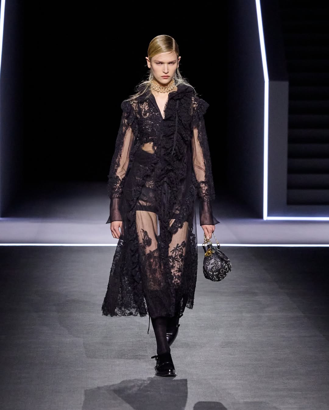Christian Dior je svoju FW25 kolekciju predstavio u prelepom ambijentu Jardin des Tuileries, stvarajući magični ugođaj koji je spojio istoriju i modernu modu pod temom Once Upon a Time. Maria Grazia Chiuri, kreativna direktorka, odala je počast legendarnom dizajneru Gianfranco Ferréu, reinterpretirajući elemente njegove estetike kroz skulpturalne čipke, korsete, blejzere i revijalne J’adore Dior majice, koje su ponovo oživele sa modernim twistom. Chiuri je uspešno spojila elemente antikviteta i moderne elegancije, što je rezultiralo spektakularnim prikazom. Kolekcija se završila spektaklom u kojem su dominirali komadi poput kožnih jakni, pernatih kaputa i metalik haljina, a sve je bilo obeleženo prepoznatljivim Dior motivima. Ova revija je još jednom pokazala da Dior i dalje ima snažan uticaj na svetsku modnu scenu.
