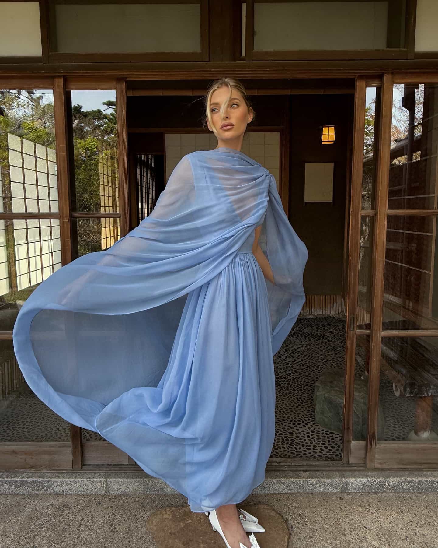 Nakon odlaska u Japan, Elsa je sa pratiocima podelila seriju fotografija koje prikazuju ne samo prelepe pejzaže i primamljive zalogaje, već i njene pažljivo osmišljene autfite. U jednoj od upečatljivijih kombinacija, Hoskova je zablistala u maksi-haljini iz sopstvenog Helsa Studija u nežnoj plavičastoj nijansi. Haljina sa dubokim deholteom, suženim strukom i lepršavom suknjom odavala je utisak lakoće i ženstvenosti. Preko ramena je prebacila šal u istoj boji, stvarajući skladnu i elegantnu celinu, dok su bele cipele sa niskom štiklom brenda Prada upotpunile ovaj sanjivi izgled.