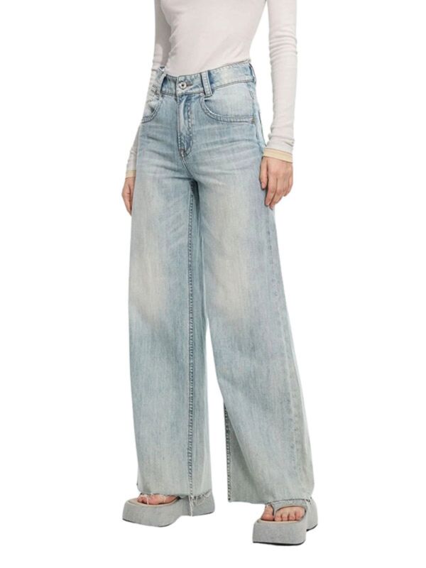 Ove farmerke imaju veoma visok struk i širi kroj nogavica. Gornji deo je uži, što doprinosi izbalansiranom i elegantnom izgledu. Idealne su za kombinacije sa ravnim cipelama, kao i za večernje prilike uz potpetice.