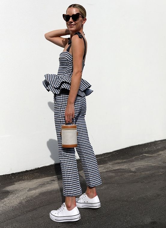 Za klasičniji letnji izgled, gingham haljina, pantalone ili suknja, uparene sa pletenom torbom idealan su izbor. Dodatni detalj, poput buketa svežeg cveća, doprinosi romantičnom šarmu. Umesto očekivanih japanki ili klompi, patike unose dozu neočekivanog, u skladu sa teorijom “pogrešne obuće” u modi, a baletanke dodatno mogu da istaknu dozu ženstvenosti.