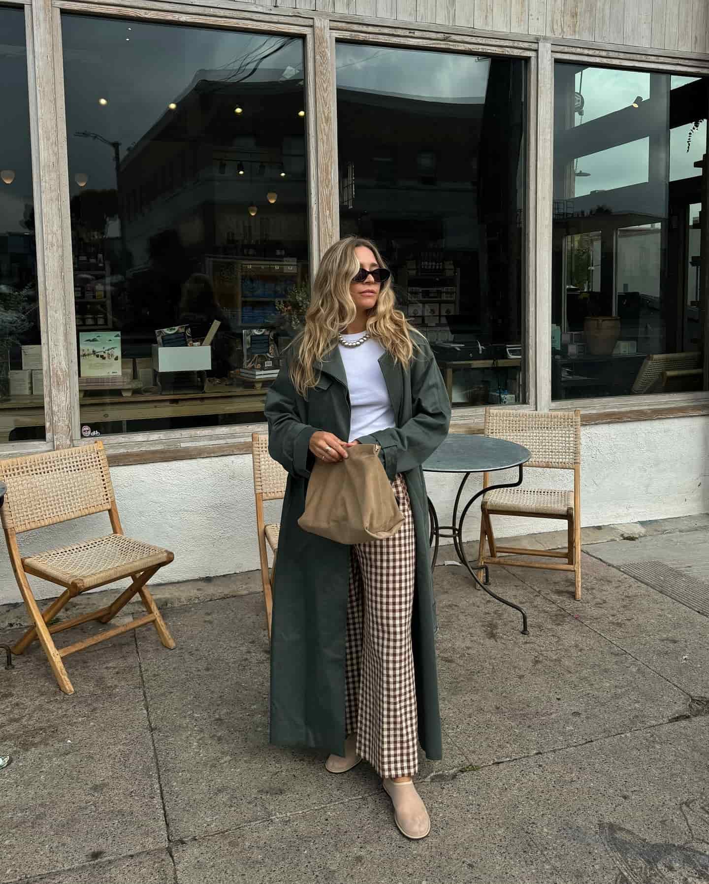 Kombinacija gingham pantalona sa klasičnom belom majicom i trench kaputom daje efekat minimalizma sa stilskim pomakom. Uz dodatke poput torbe od brušene kože, ogrlice sa perlicama i ravnih mrežastih baletanki, postiže se balans između jednostavnosti i aktuelnog trenda.