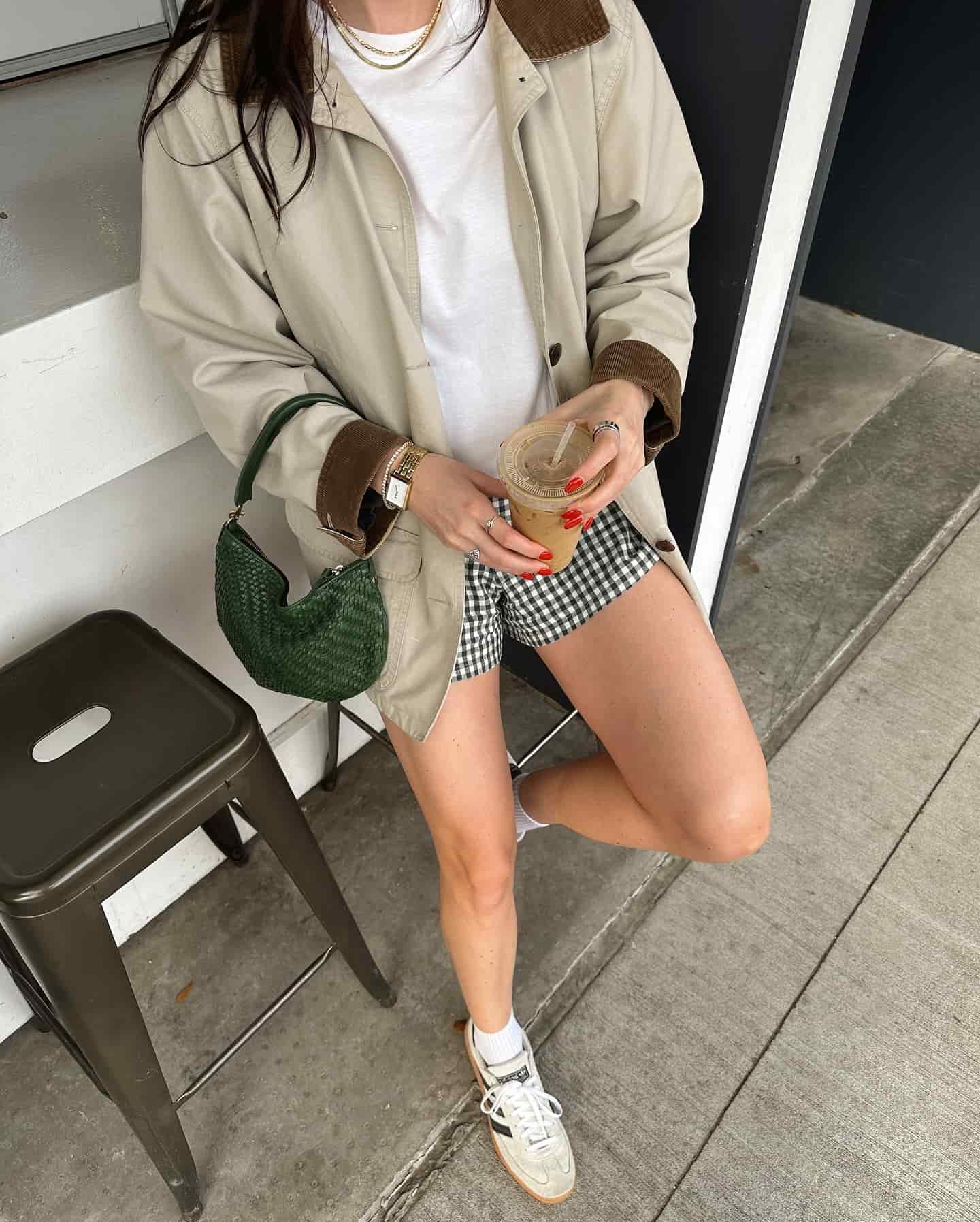 Šortsevi su i dalje aktuelan trend iz 2024. godine, a ove sezone dostupni su i u gingham varijanti. Za razliku od klasičnih sandala, patike unose sportski duh i osvežavaju ovu ženstvenu formu šortsa. Uparene sa laganom jaknom u rustičnom stilu, čine udoban i moderan letnji autfit.