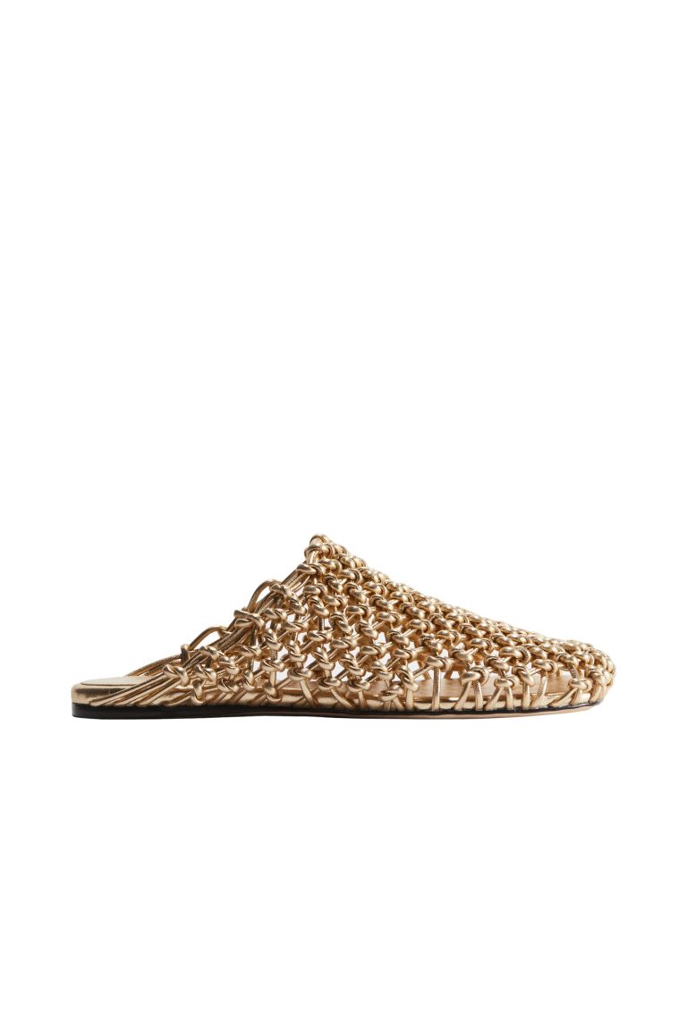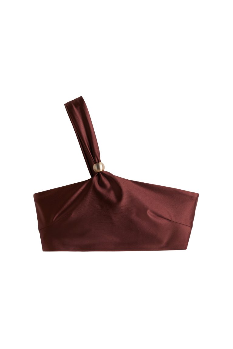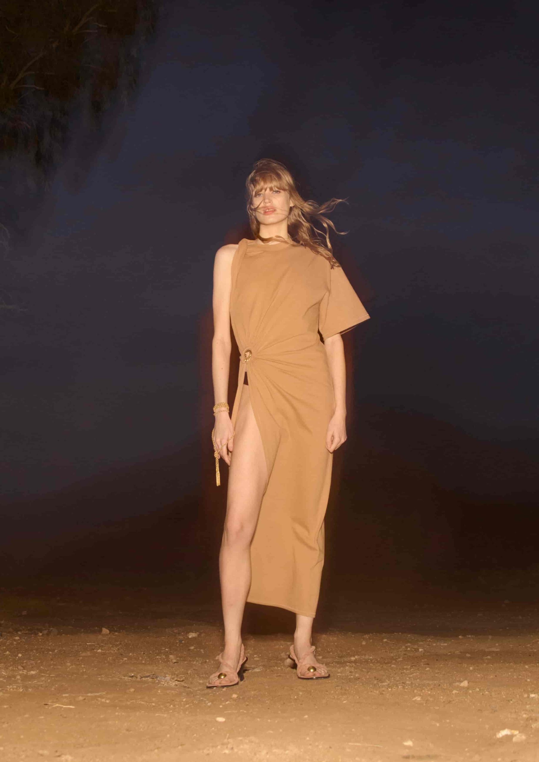Modni dodaci uključuju terakota bikini sa asimetričnim gornjim delom, zlatne ravne mule papuče, sandale sa visokim potpeticama, kožnu torbu u boji svetle terakote sa detaljima od zlatnih niti i zlatnim detaljima, naočare za sunce, ogrlicu sa resama i minđuše ukrašene nitnama i kristalnim perlama.