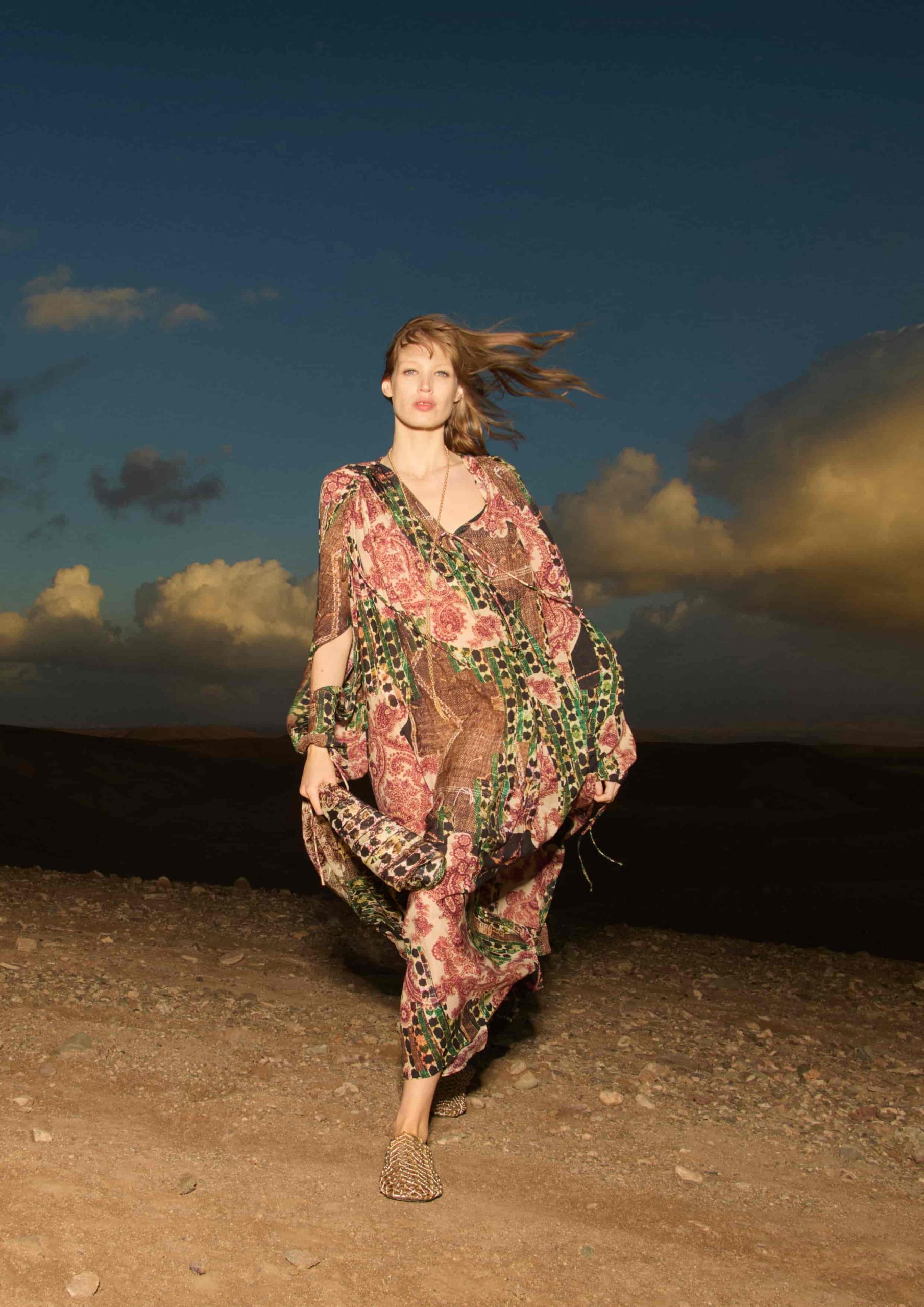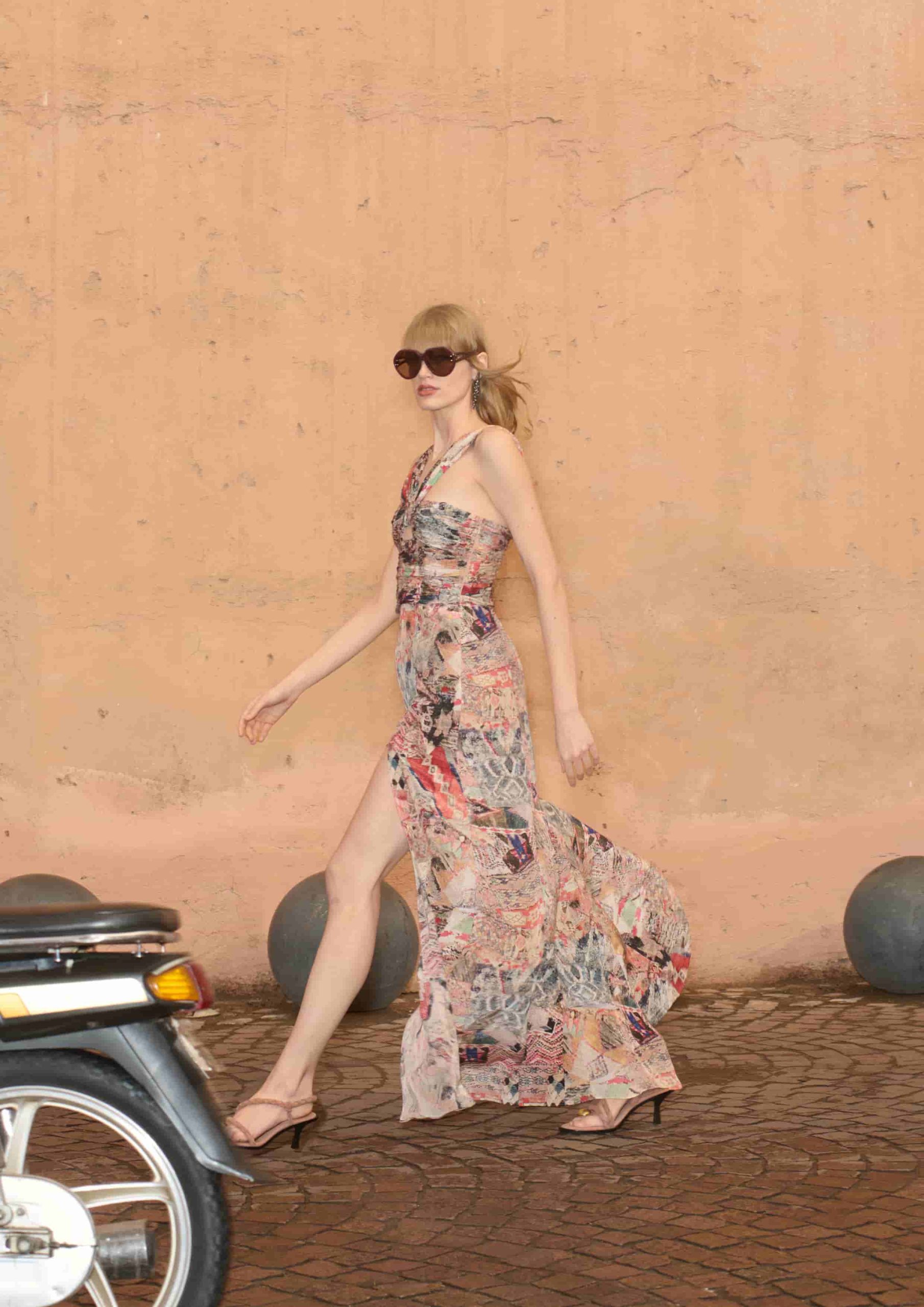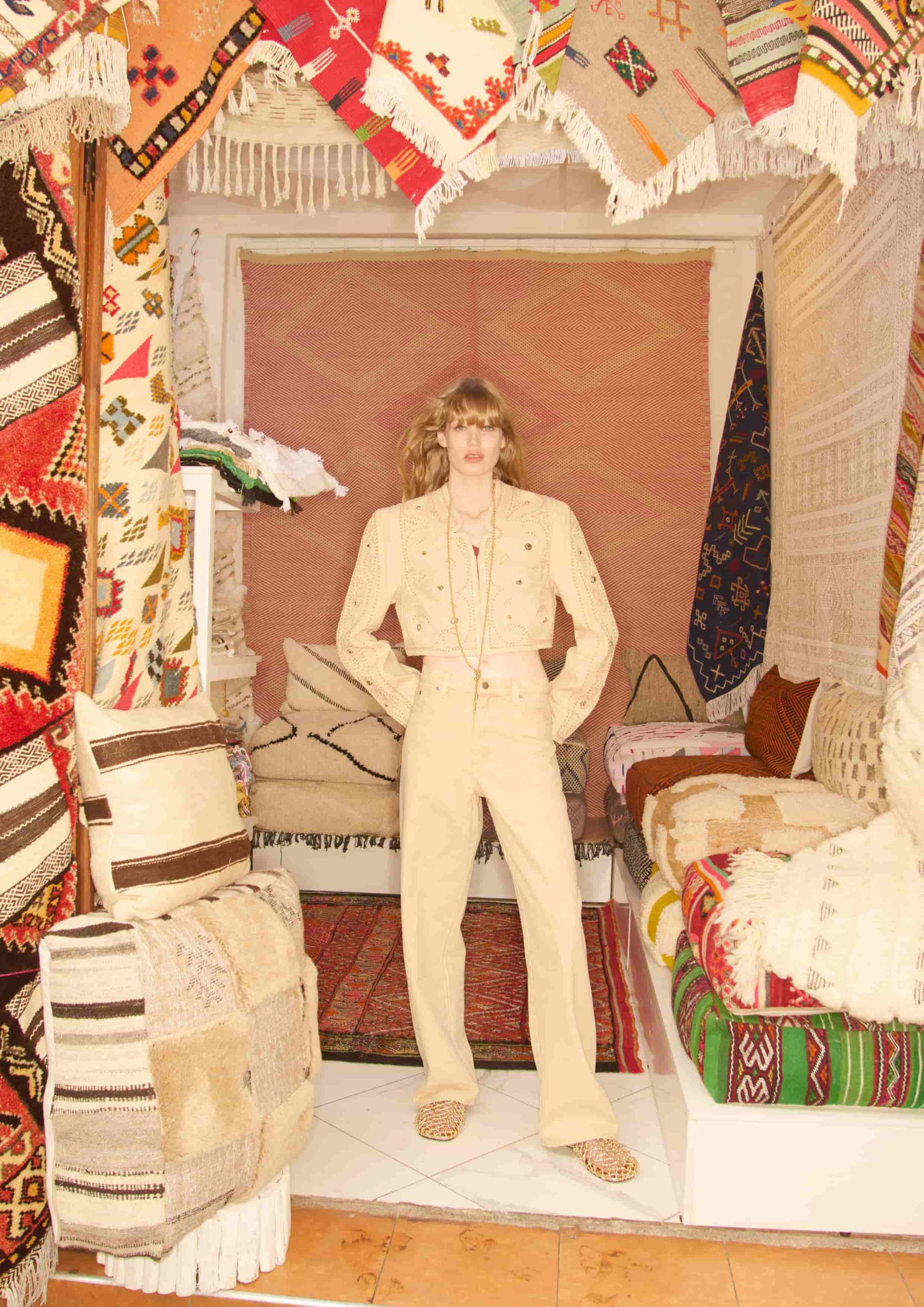 Paleta boja se kreće od umirujuće terakote, preko bež nijansi sa crnom i belom, do najživopisnijih plavih tonova. Materijali uključuju lan, pamuk i šifon koji se lako kreću. Ključni komadi su krop bež pamučna jakna, ukrašena nitnama i bogatim vezom. Može se kombinovati sa bež farmerkama koje imaju nitne duž bočnih šavova. Kaftani sa printom maksi dužine prelepo se kreću u prilagođenim patchwork printovima koji slojevito prikazuju ikonične marokanske motive.
