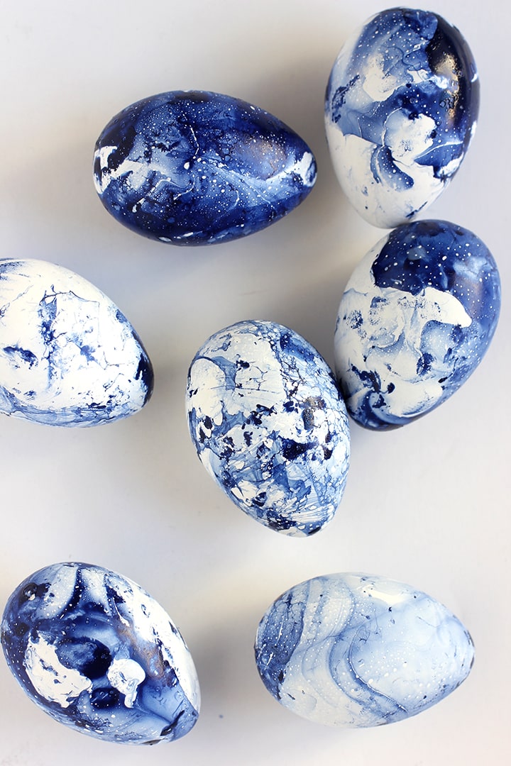 Mermer je sjajan kada je u pitanju uređenje enterijera, pa zašto ga ne bismo primenili i na Uskršnja jaja? Ova dubokoplava boja u šari podseća na “shibori” (japansku tehniku bojenja). Kada bojite jaja, svaki dizajn će biti autentičan, što je super ako pogrešite prvih par puta. Sve što vam je potrebno je voda i plavi lak za nokte da kreirate vijudavu šaru. Obavezno nosite rukavice!