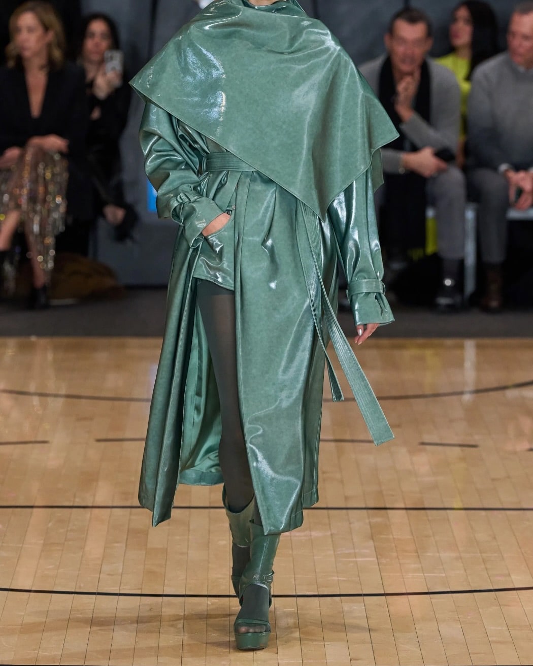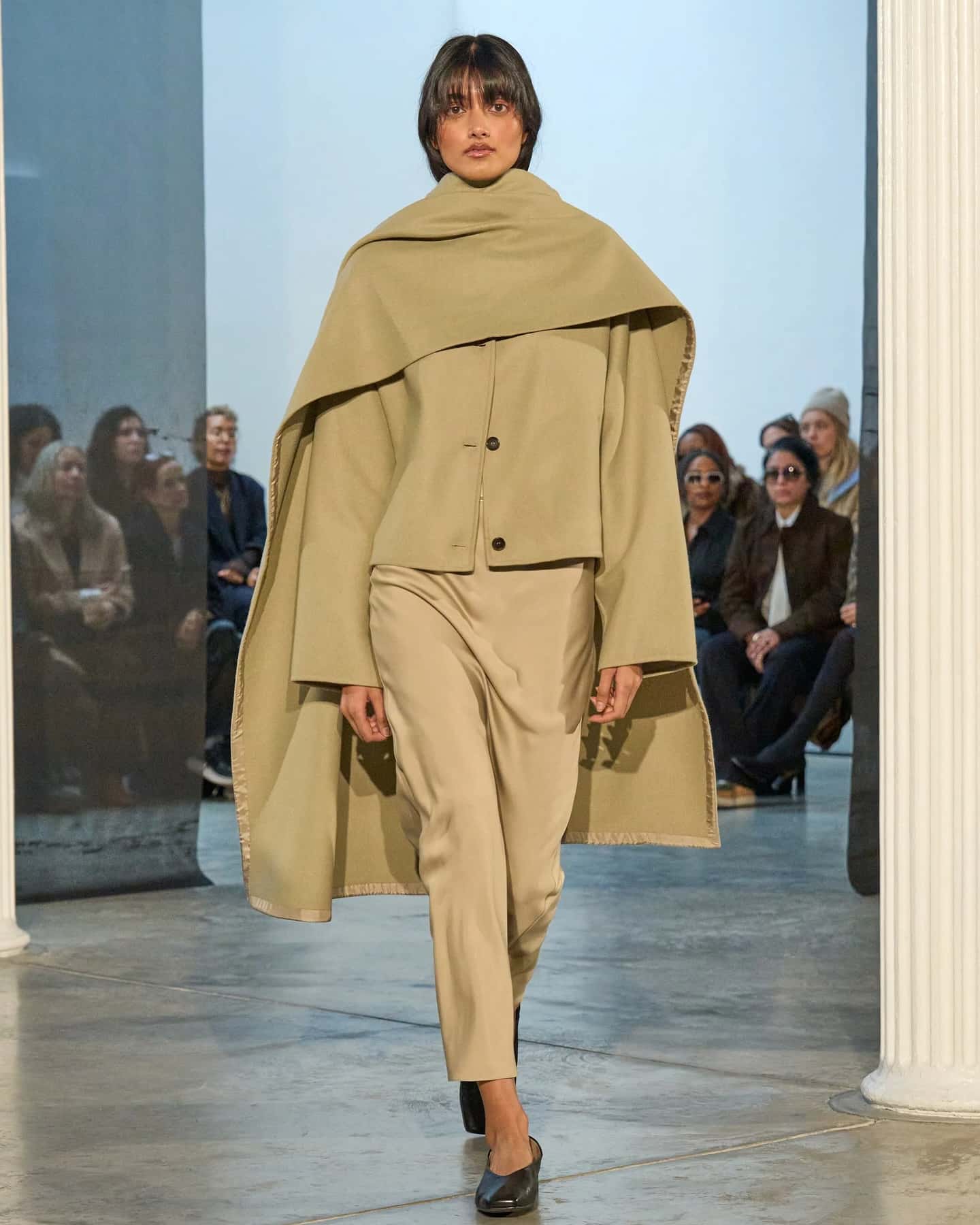 Catherine Holstein iz brenda Khaite predstavila je dizajn koji kombinuje krzneni ogrtač sa skraćenim kaputom, pružajući elegantan izgled. Slično tome, australijski brend Scanlan Theodore osmislio je luksuzni kaput sa pelerinom od crnog veštačkog krzna i kože. Kod Kallmeyera istakao se model u neutralnim tonovima, dok je meksička dizajnerka Stephanie Suberville kroz svoj brend Heirlome prikazala kaput sa masivnim kašmirskim šalom.