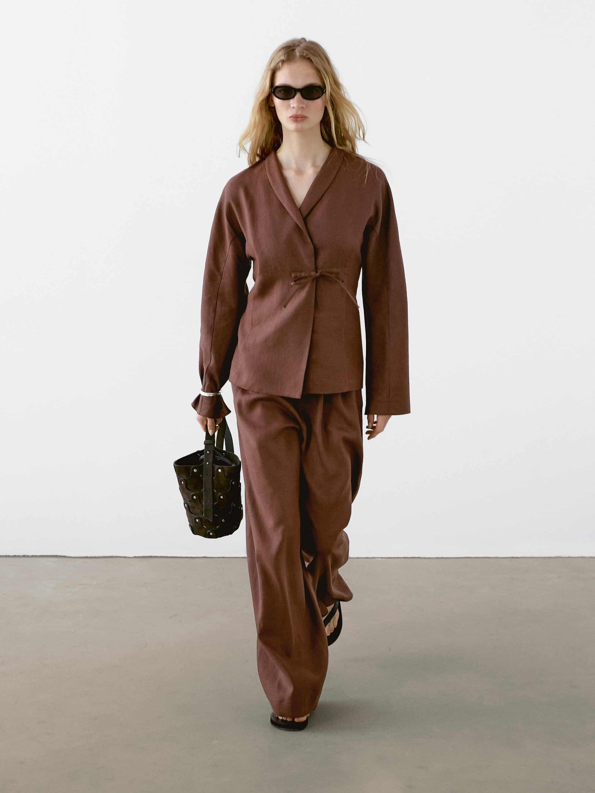 Sako izrađen od 100% lana naćiće se u ormaru svake urbane dame. Kragna sa špicastim reverima, dugi rukavi sa manžetnamai šlicem sa zadnje strane biće vaš omiljeni saveznik tokom letnjih meseci – kako za kancelariju tako i za večernje šetnje. Luksuzna boja tamne cigle dodatno ističe eleganciju ovog komada što je još jedan razlog da se nađe u vašem ormaru.