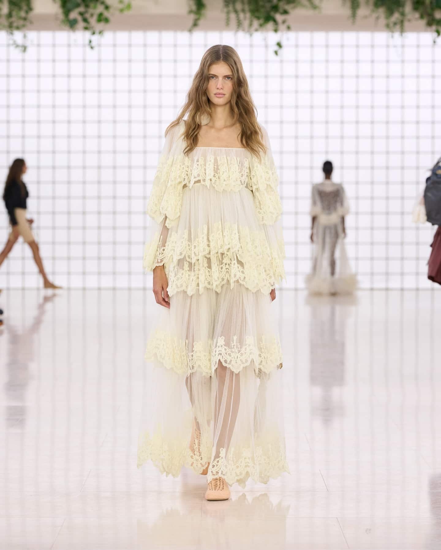 Inspirisan ikonama poput Sienne Miller i Kate Moss, boho stil za 2025. donosi luksuzne materijale i ženstvene krojeve. Na revijama Chloé dominiraju haljine od čipke, široke bluze i duge ogrlice, dok Isabel Marant nudi rese i lagane mini suknje koje asociraju na muzičke festivale. Iako inspirisan festivalima, ovaj stil savršeno funkcioniše i u večernjim izlascima.