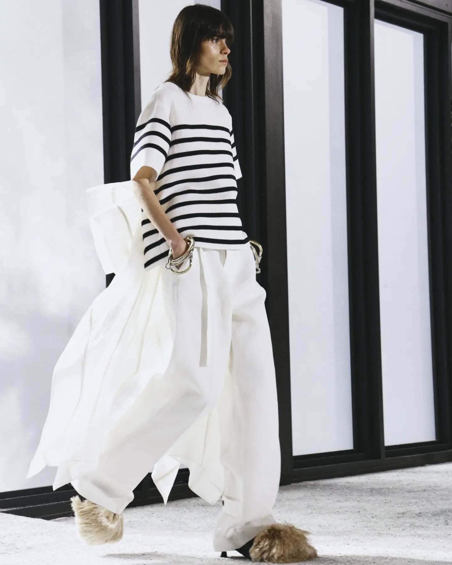 Mornarski trend, poznat i kao fisherman core, bio je prisutan još prošle godine, a sada je u punom jeku. Miu Miu je ponudio mokasine u mornarskom stilu, dok Sacai kombinuje prugaste majice sa elegantnim belim pantalonama. Na društvenim mrežama sve je više outfita sa sandalama u ribarskom stilu i nakitom inspirisanim morem.