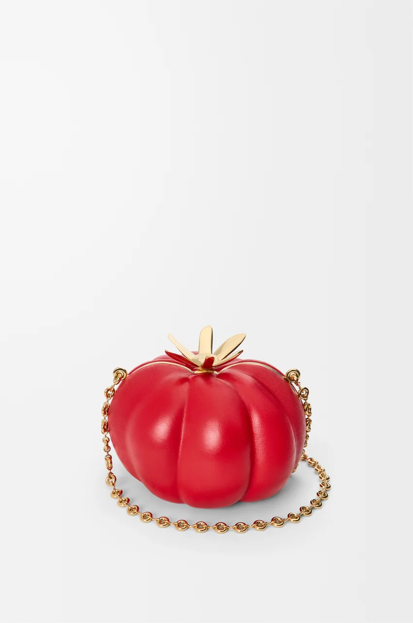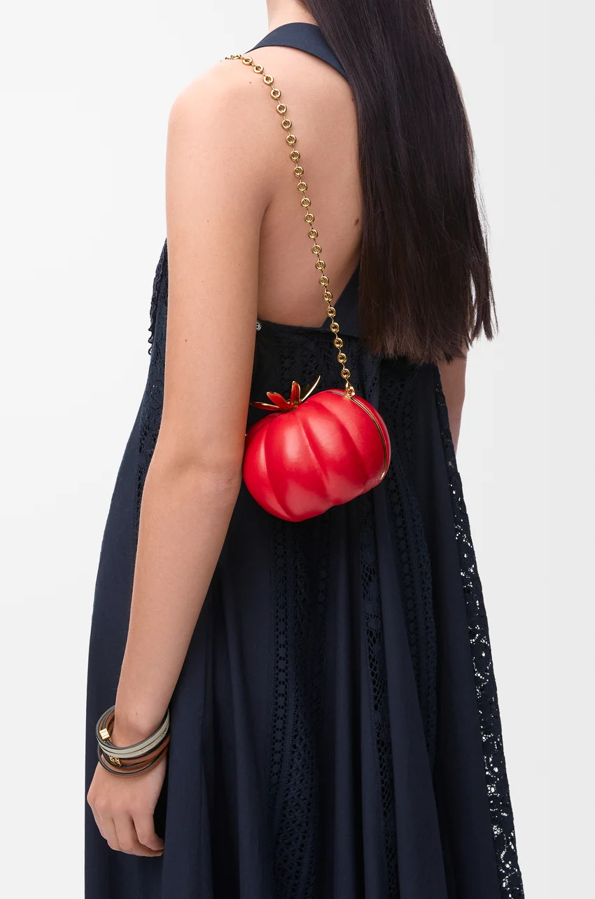 Tomato Clutch brenda Loewe duhovit je odgovor na opsesiju interneta da obične stvari pretvori u modne senzacije. Sve je počelo kao viralni mim – fotografija savršeno zaobljenog paradajza sorte heirloom, koji je modni Tviter proglasio “tako Loewe”. Kreativni direktor Jonathan Anderson pretvorio je ovu šalu u skulpturalni modni dodatak, a mi vam donosimo detalje o ovom vanvremenskom aksesoaru.