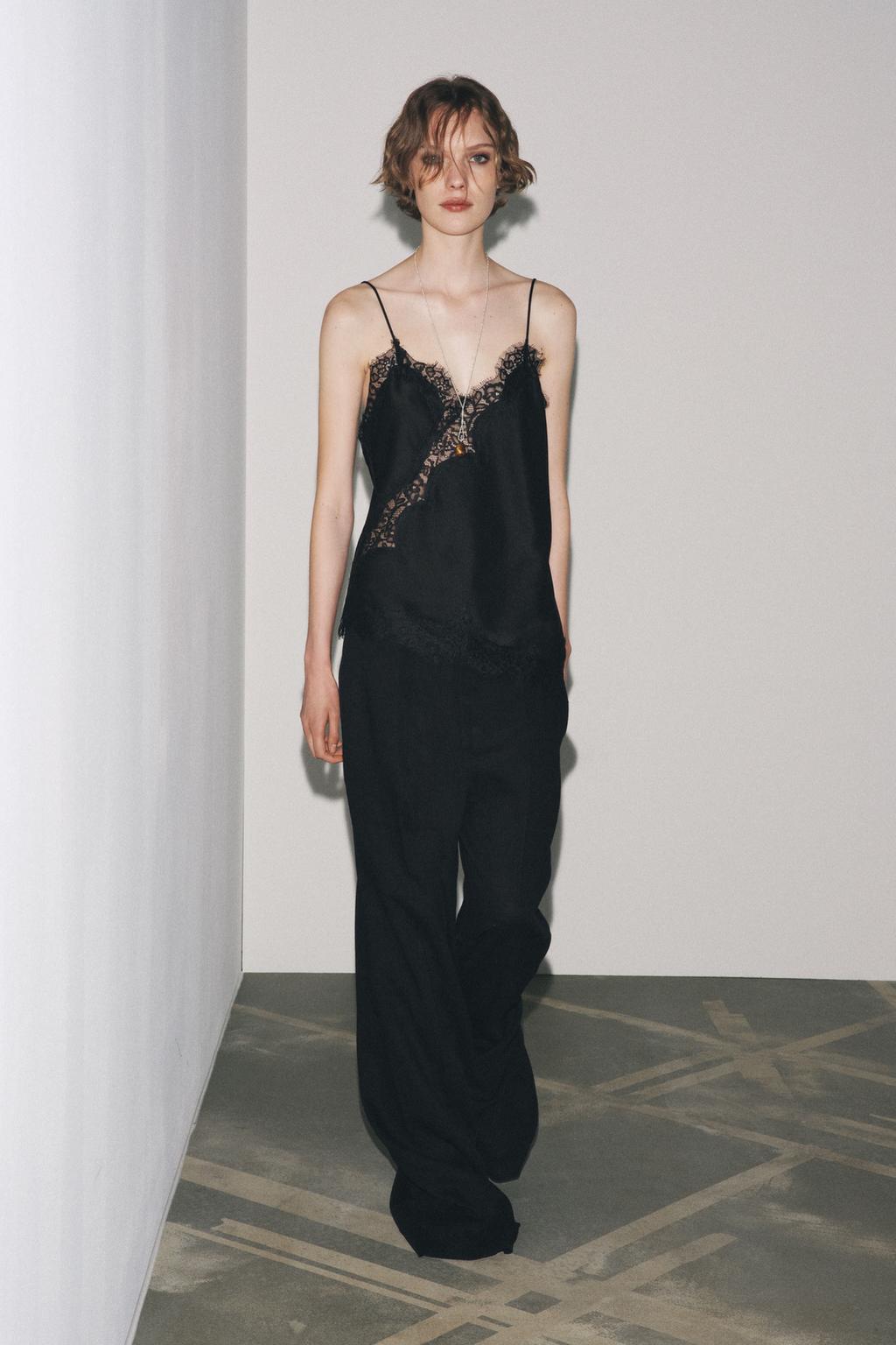 Jednostavna majica na bretele sa čipkastim uzorkom savršena je za večernje varijante. Nosite je uz suknju ili pantalone.