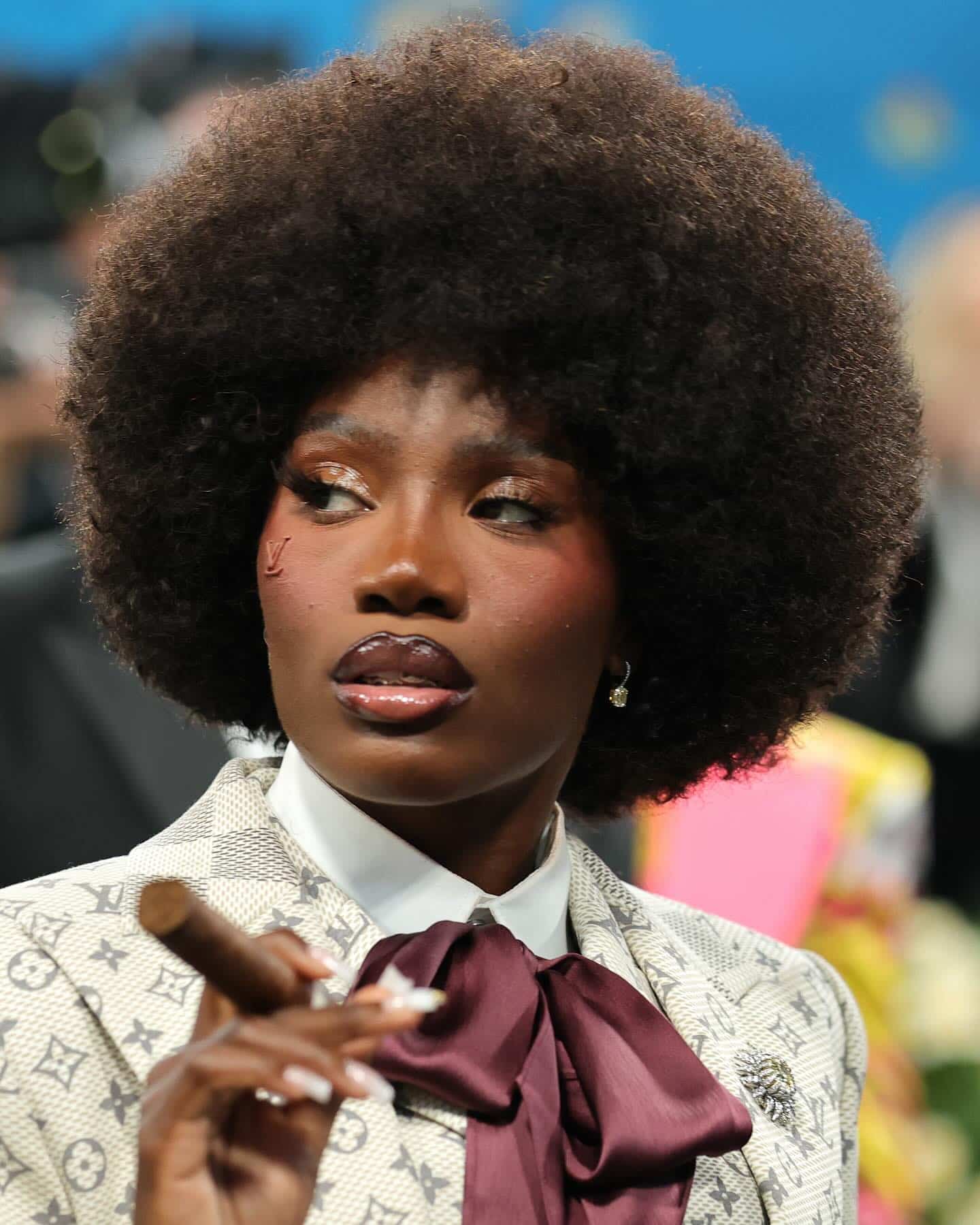 Reperka Doechii je očarala sve afro frizurom, monohromatskim makeup-om i upečatljivim detaljem na obrazu u vidu Louis Vuitton monograma.