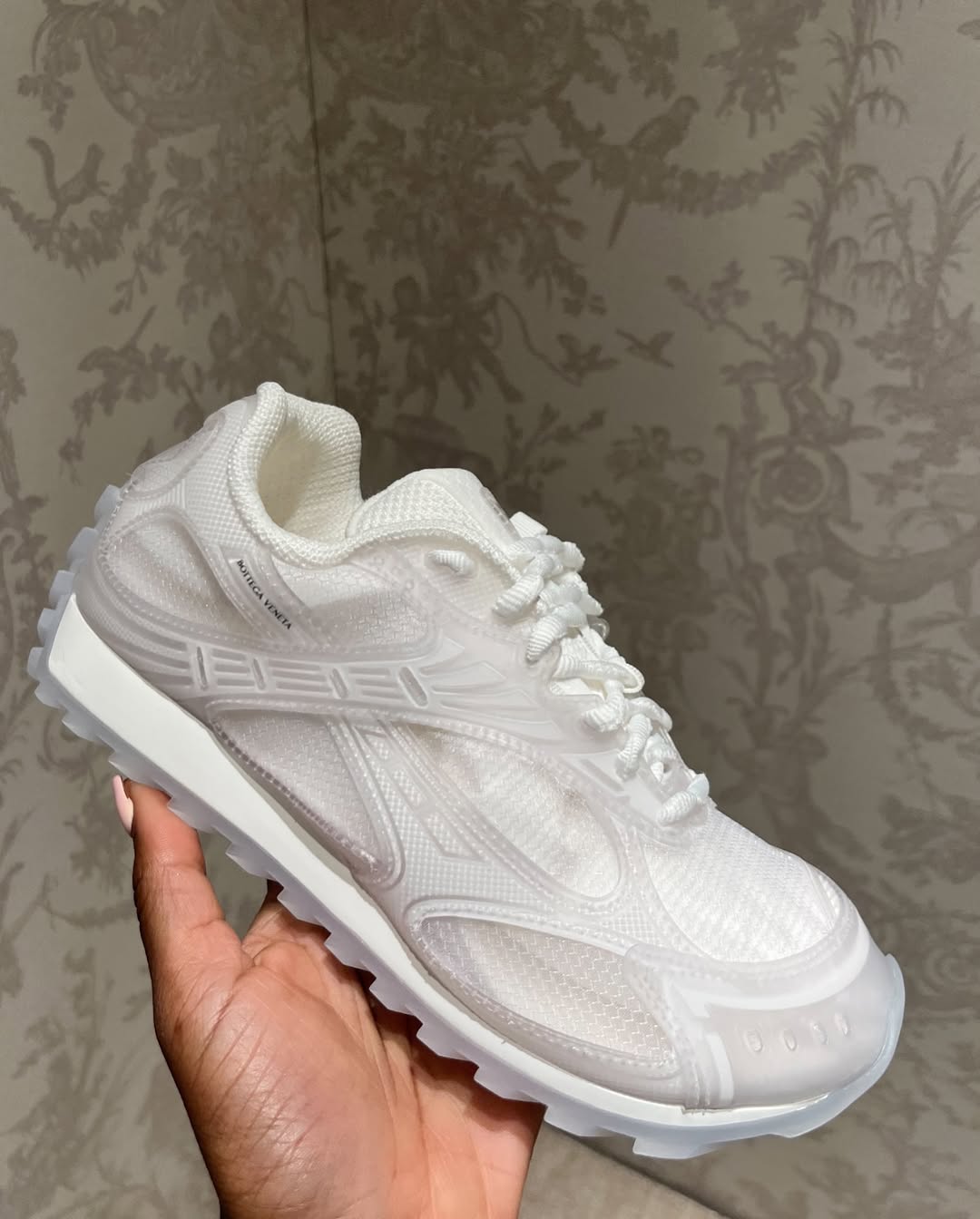 Patike Bottega Veneta sa futurističkim upgradeom u boji staklene bele predstavljaju dizajnerski rad koji je na prvi pogled tehnički, ali kada se malo bolje zagledate otkriva detalje koji su prepoznatljivi za brend Bottega Veneta – diskretno postavljen logo i providni mrežasti paneli koji podsećaju na prepoznatljivo intrecciato kožno tkanje.