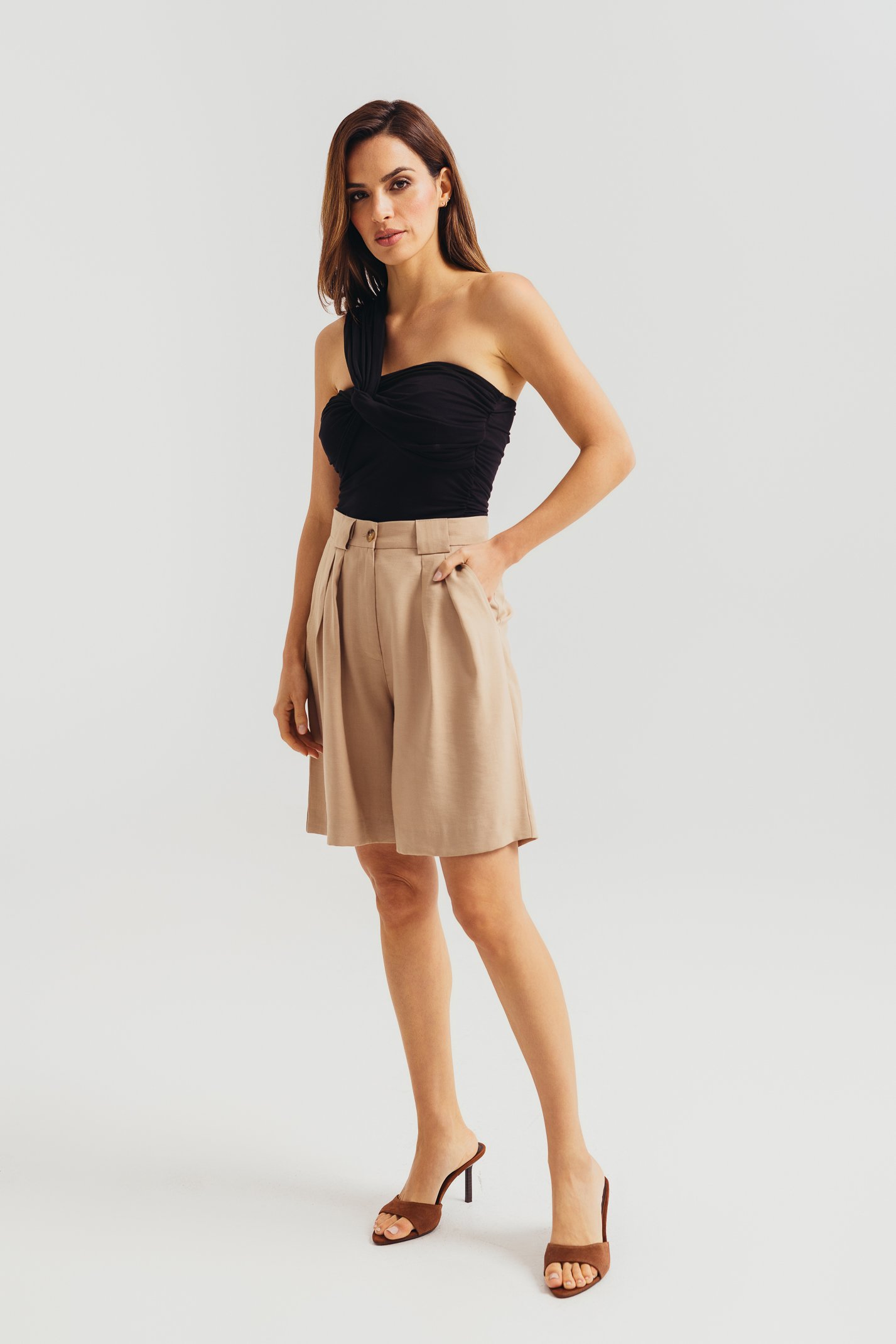 Zaboravite na uske teksas šortseve – bermude do kolena od lana ili pamuka su daleko bolji izbor. Visok struk i opušteni kroj čine ih prikladnim i za kancelariju, naročito ako ih uparite sa košuljom bez rukava u istom materijalu.