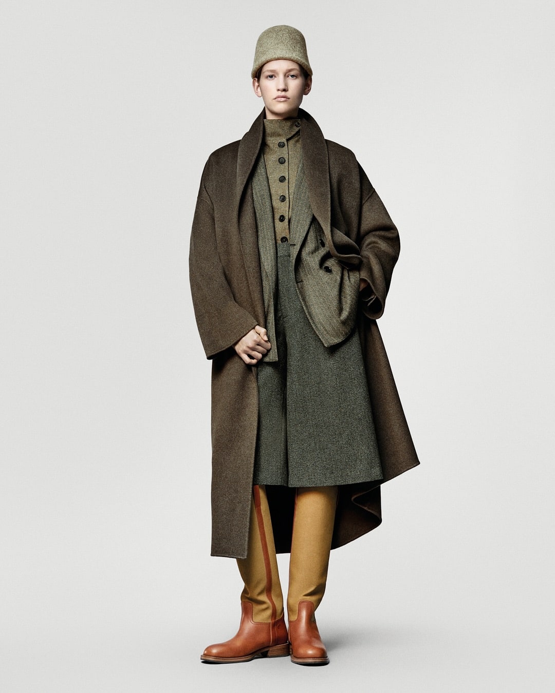 Muška linija prati istu geografsku i konceptualnu nit kao i ženska. Odevni komadi, mekani, ali strukturni, naglašavaju praktičnost bez kompromisa po pitanju elegancije. Pantalone opuštenog kroja dizajnirane su tako da se mogu nositi unutar jahačkih čizama, dok se legendarna Maremma jakna od pamuk-kašmira vraća kao ključni komad u više varijanti. Prošivene jakne osvajaju avanturističkim duhom kolekcije, dok formalna odeća dobija opušteniju formu kroz odela i oversized kapute. Prirodne nijanse kreću se od zelene do Espresso i Fondue Fudge braon. U večernjim satima kolekcija postaje sofisticiranija uz crne Spagna pelerine i klasične smoking kombinacije. Aksesoari, od sklopivih torbi do novih verzija Loom Bag u Nubuck Zibeline izdanju, naglašavaju svestranost i umetničku zanatsku veštinu ove kolekcije.