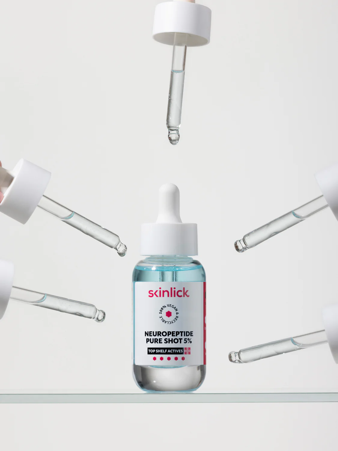 Skinlick Neuropeptide Pure Shot 5% je zaglađujući i popunjavajući serum s 5% unapređene Argireline® Amplified peptidnog rastvora. Lagane je vodenaste teksture te je pogodan za sve tipove kože. Moćna formula bez ulja sadrži visoku koncentraciju Argireline® Amplified peptida u rastvoru, poznatog po svojim svojstvima koja pomažu u smanjenju bora i finih linija.