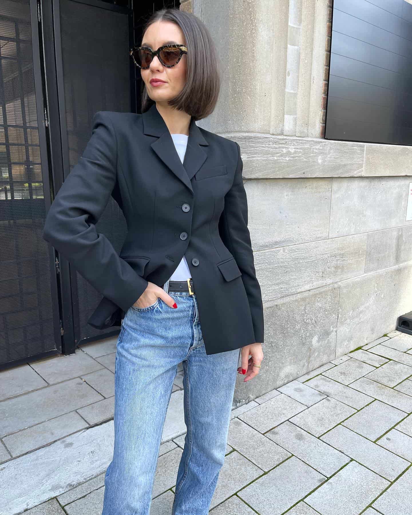 Blejzer preko bele košulje je savršena kombinacija za posao. Ako je džins prihvaćen, odlučite se za model sa ravnim nogavicama, koji je elegantan i ujedno udoban. Na kraju, dodajte slingback štikle koje su idealan izbor za one koji vole male potpetice za dodatak elegancije.