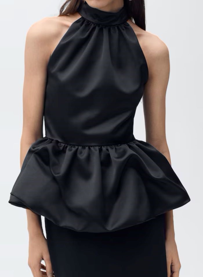 Predivan svečani top sa balon efektom, izdvajamo iz kolekcije topova za zabave i svečanosti. Top je bez rukava, sa halter kragnom koja se vezuje širokip trakama koje padaju niz leđa. Sa ukrojenog struka širi se bogato nabran karner sa balon efektom. Dizajniran je za svečane prilike i u kombinaciji sa uskom crnom suknjom, ili zvonastim pantalonama, učiniće da se osećate i izgledate posebno stilizovano i elegantno. Na istoj stranici možete naći i druge modele drapiranih i asimetričnih svečanih topova, kao i odgovarajuću suknju sa kojom se mogu upariti.