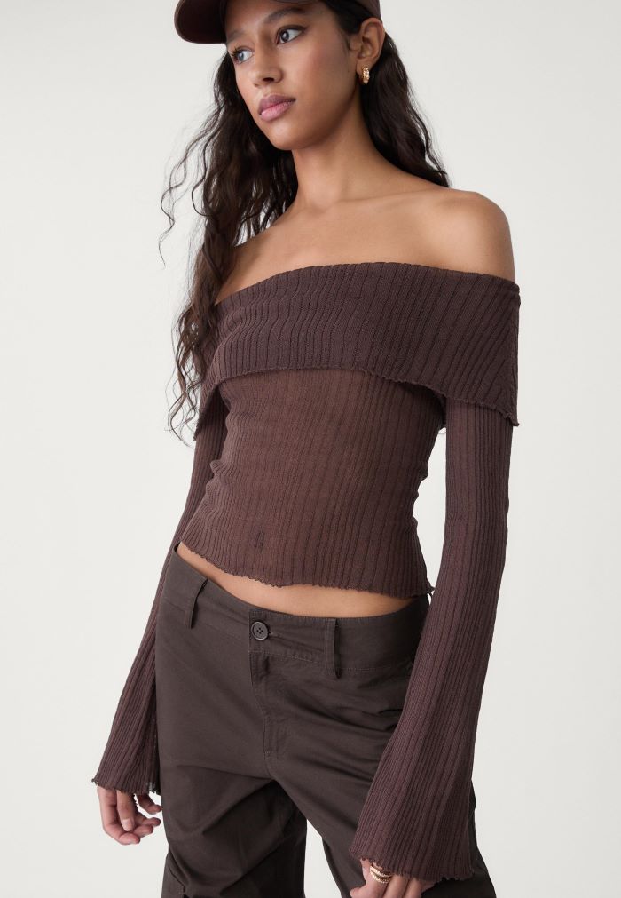Stradivariusovi prolećni topovi se kreću u širokom spektru asimetričnih i ravnih krojeva u zemljanim tonovima, koji se lako uklapaju u sve odevne kombinacije. Posebno nam se dopao kratak, mek džemper sa rebrastom teksturom i čamac izrezom koji otkriva ramena. Preklop na gornjem delu savršeno se uklapa sa dugim zvonastim rukavima, ističući ležernost i udobnost. Jednako ženstveno igleda u sportskim kombinacijama, koje nosi manekenka na fotografijama, a dostupan je i u beloj boji.