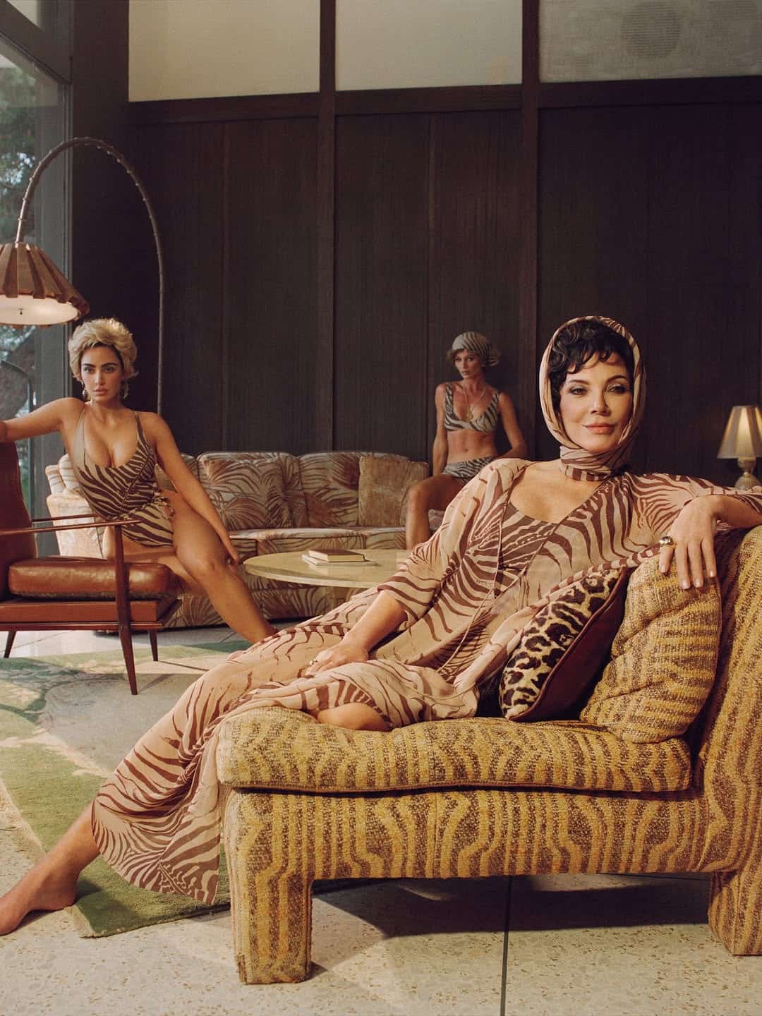 Poznata po svom zasićenom koloritu i retro-futurističkoj estetici, Cohen je Roberto Cavalli x Skims vizuale pretvorila u mešavinu sna i razglednice sa odmora. Kim Kardashian predvodi kampanju zajedno sa svojom majkom Kris Jenner, koja je, prema navodima, videla uzorke i odmah izrazila želju da učestvuje u snimanju. Rezultat je stilizovana, filmska fantazija u kojoj obe poziraju u tirkiznim printovima džungle i prugama tigra, smeštene u enterijere inspirisane sredinom prošlog veka sa nadrealnim detaljima. Zamislite: zebrina kaftan-haljina na baršunastom kauču ili korsetska haljina uhvaćena u Coheninom prepoznatljivom ogledalu.