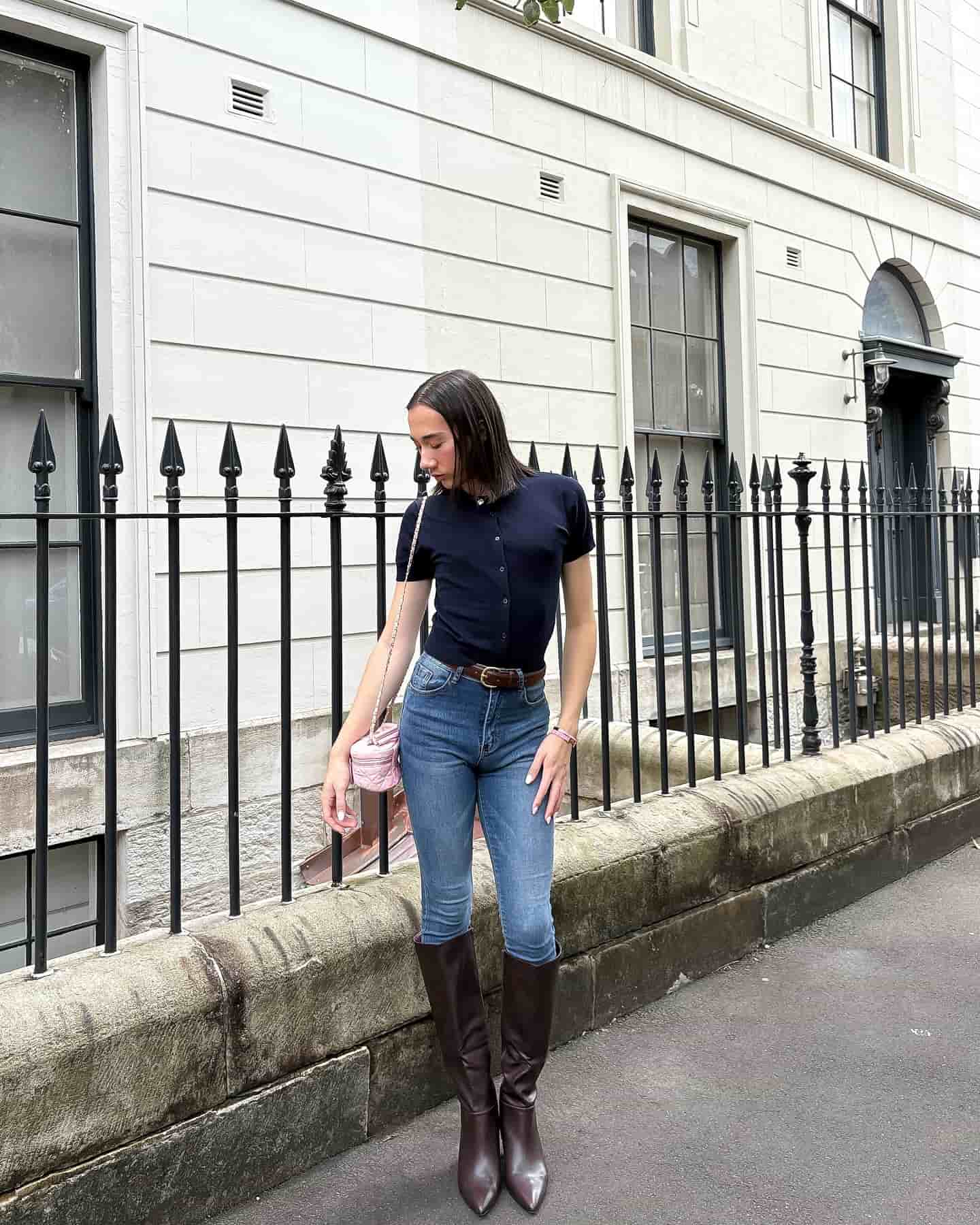 Jedan od najjednostavnijih i najelegantnijih načina da se uske farmerke nose na moderan način jeste da se uvuku u visoke čizme. Ovaj stil vraća u modu duh jahačkih i vojničkih uticaja, koji su uvek popularni tokom hladnijih meseci. Čizme do kolena, posebno u tamnim tonovima poput crne ili tamnobraon, savršeno se slažu sa užim nogavicama farmerki. Uz to, dodatkom dugačkog blejzera, klasične košulje ili rolke i strukturirane torbe stvara se autfit koji je istovremeno sofisticiran i pogodan za poslovno okruženje. Ova kombinacija naglašava vertikalne linije tela, čime vizuelno izdužuje figuru i unosi dozu formalnosti čak i u ležerne prilike.