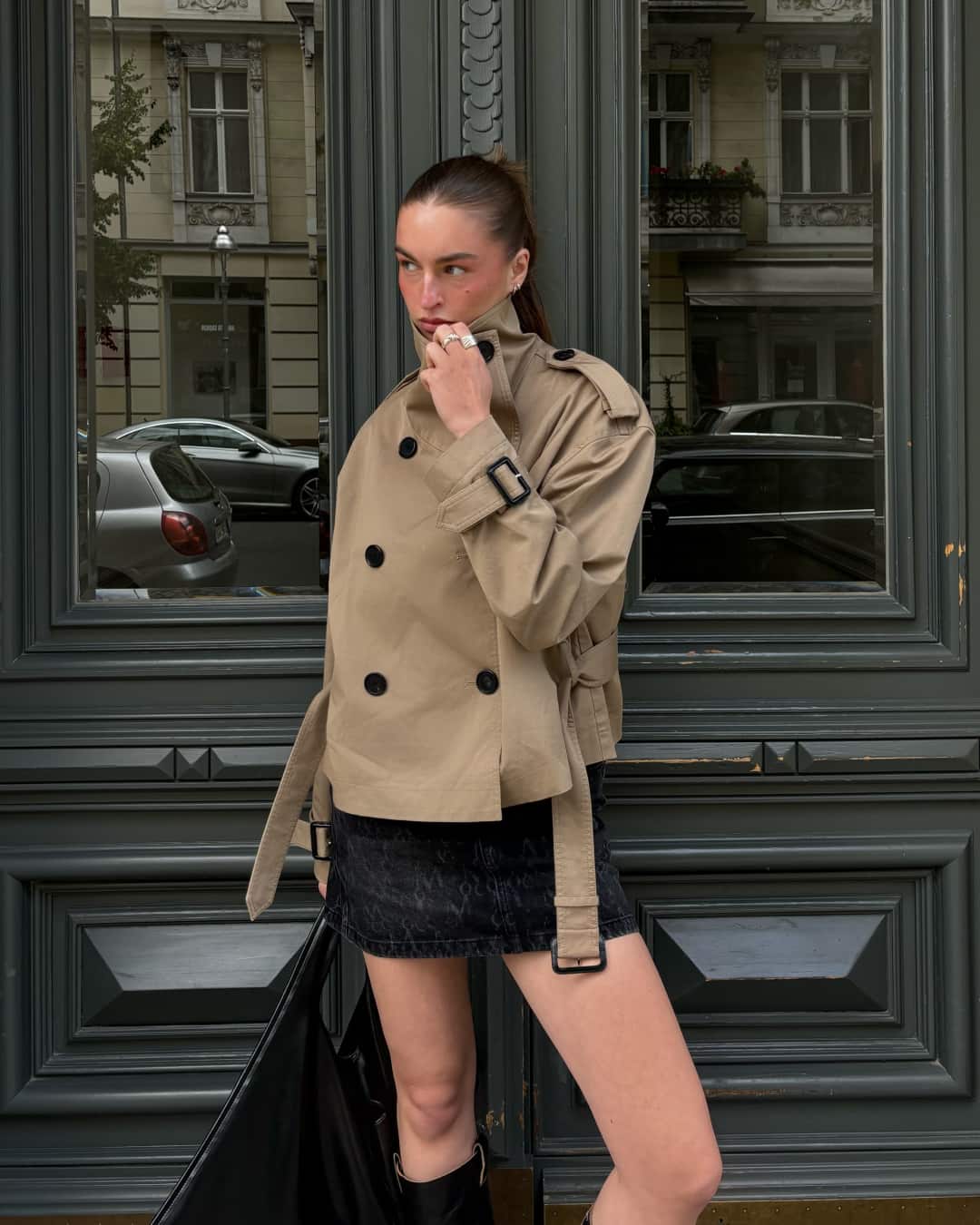 Trenč mantili su večni klasik, ali novi trend ih donosi u skraćenoj verziji. Ovi modeli zadržavaju prepoznatljivu formu i kroj, ali sa dužinom do struka ili sredine bokova, što ih čini savršenim za prolećne temperature. Skraćeni trenč uparuje se sa lepršavim suknjama, pantalonama visokog struka ili slojevitim kombinacijama. Dodaje modernu dinamiku svakom autfitu, dok i dalje zadržava eleganciju klasične garderobe. Boje poput bež, maslinaste ili čak tamnoplave dominiraju u ovoj varijanti, a materijali su često lagani i otporni na vetar i kišu.