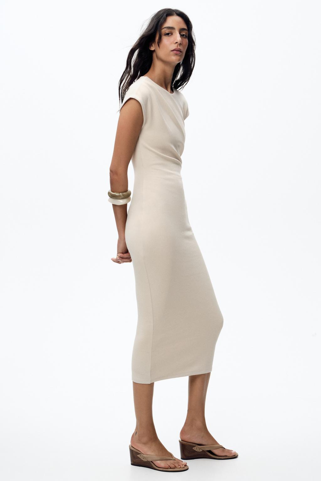 Model od rebrastog materijala u nijansi slonovače prianja uz telo poput druge kože. Nabori pri dnu prate prirodno kretanje tela. Bez komplikovanih krojeva ili završnih obrada, snaga ovog dizajna leži u jednostavnosti materijala i eleganciji forme. Preporučuje se izbegavanje potpuno monohromatskog izgleda – jake cipele, diskretan nakit koji ne remeti siluetu, i strukturirana torba za vizuelni kontrast.