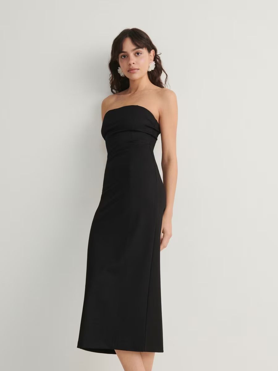 U svojoj najčistijoj formi, crna duga ili midi haljina dolazi bez rukava, pripijena uz telo i seže do poda, ili članaka. Bez uvoda i bez završetka – samo telo i linija. Savršeno krojena, zahteva jednako precizne dodatke: tanke sandale, geometrijsku torbu i svedenost u nastupu. Ovde nije “manje je više” – već “manje je sve”.