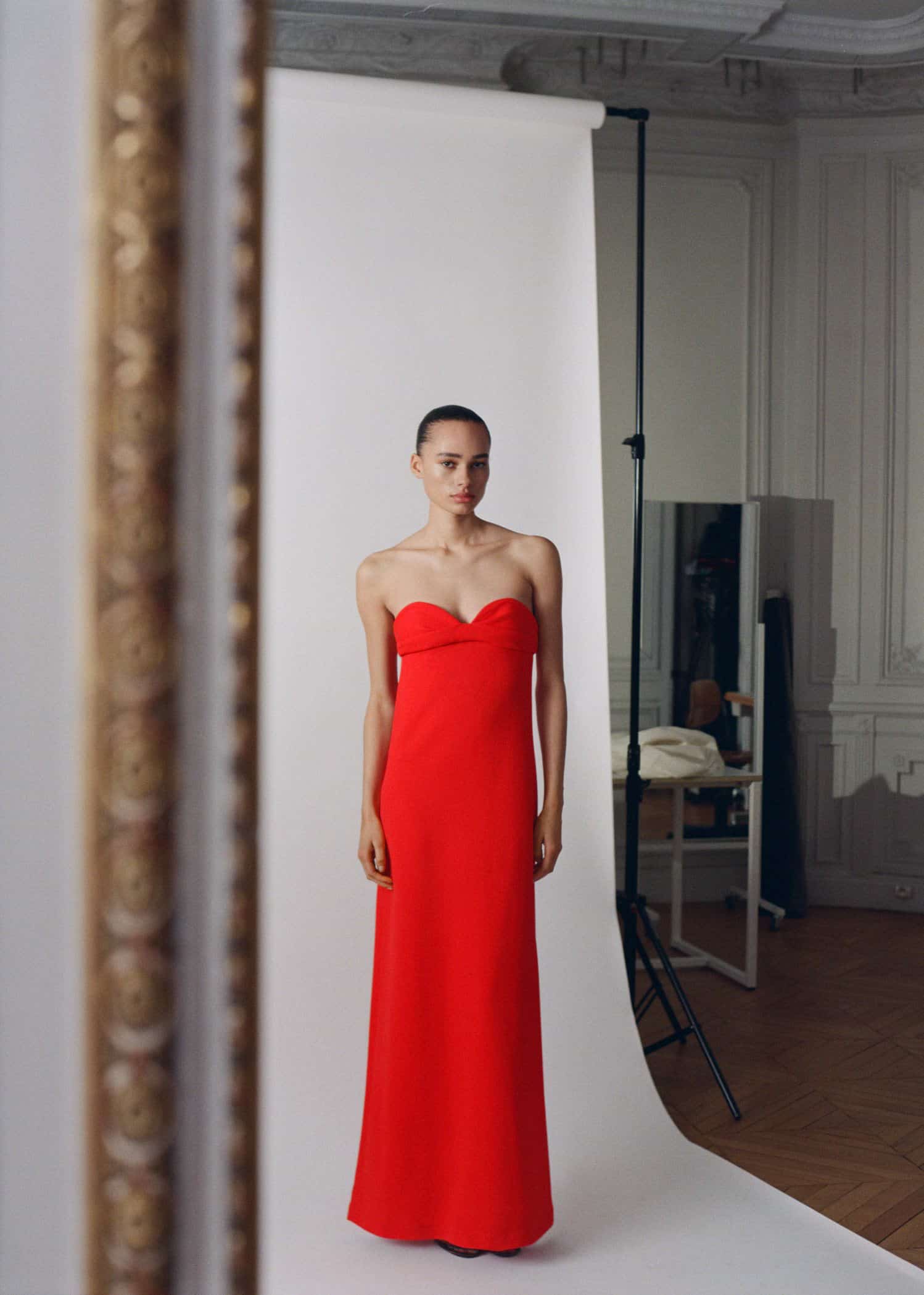 Jednostavna haljina od satena sa strukturiranim deholteom, donosi dozu sofisticirane dramatike. Iako je potpuno ravna bez drapiranja idealna je forma za skoro svaki događaj. Narandžasta boja sama po sebi nosi poruku radosti – a u ovom vremenskom periodu priziva leto. Ravnoteža je ključna – diskretne minđuše, mat srebrna torbica i cipele sa niskom potpeticom koje vizuelno produžavaju liniju sasvim su dovoljne da obogate ceo autfit.