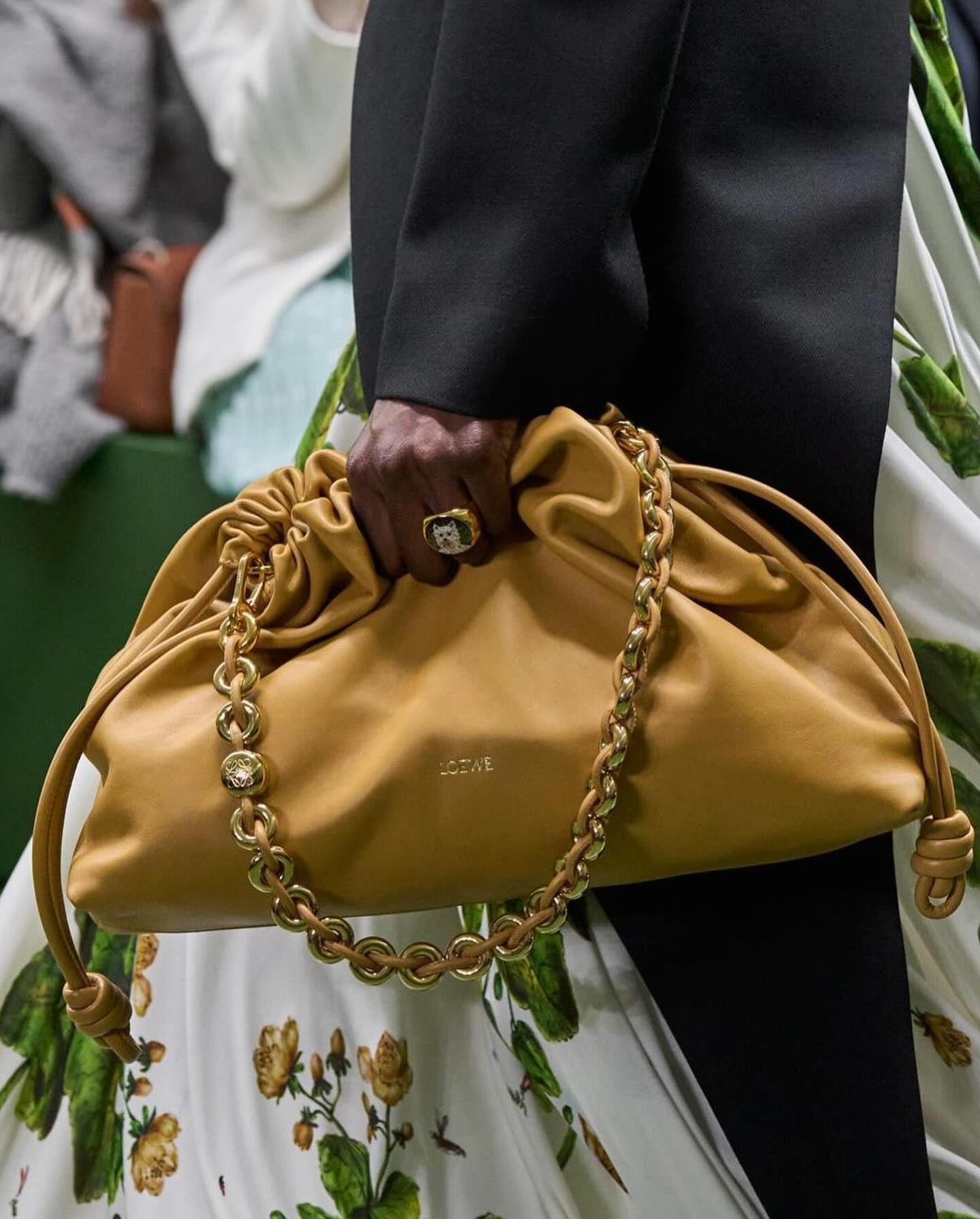 I nije samo Bottega Veneta – gotovo svaki dizajner sada čini clutch torbe većim. Ferragamo je prikazao luksuznu verziju vintage novčanika na svojoj prolećnoj reviji 2025. godine, otkrivajući oversized torbu u okviru koja je bila jednako nostalgična i moderna. Maximilian Davis, kreativni direktor kuće Ferragamo, reinterpretirao je popularnu torbu Hug kao envelope-style clutch, pružajući prostranu, a opet meko strukturiranu siluetu. Loewe je svoju meku torbu Flamenco sada predstavio u verziji Large Clutch, što je u suštini luksuzni kožni jastuk sa diskretnim logotipom. Flamenco torba, koja je prvobitno lansirana 1970-ih, ponovo je uvedena od strane dizajnera Jonathana Andersona i odmah postala popularna. Najnovija verzija u velikim dimenzijama uzima ključne karakteristike Flamenco torbe – gornji deo sa zatezanjem i čvorastim resama – i povećava ih do zapanjujućih dimenzija. Čak i avangardni brendovi i high-street brendovi kreiraju pufnaste, pokrivače veličine clutch torbi u svim vrstama materijala, od mekane napa kože do pletene rafije, kako bi iskoristili ovu pomamu.