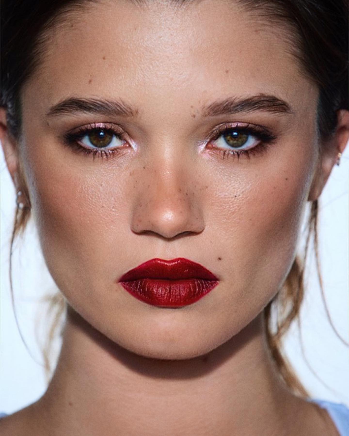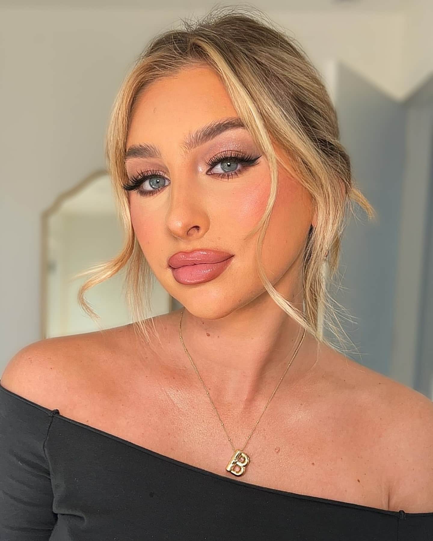 Rumenilo u toplim tonovima naneto visoko na jagodice daje licu osvežavajući izgled. U kombinaciji sa neutralnim karminom i sjajem na usnama, ova šminka postiže balans između jednostavnosti i upečatljivosti.
